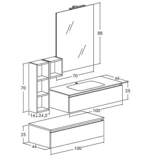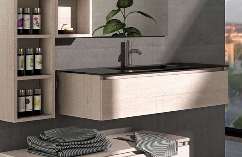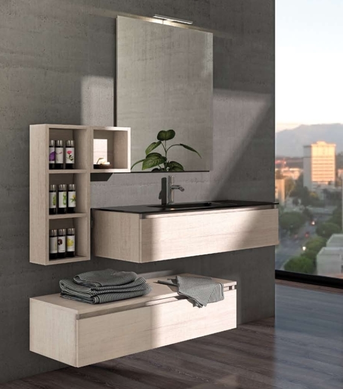Art - W 03 - Composizione Bagno ModernaART - W 03 - BAGNO COMPONIBILE MODERNO Finitura : Rovere Tranche' Chiaro Basi sospese con cassettoni a chiusura assistita , pensili a giorno Top Lavabo in vetro con vasca integrata colore nero Specchiera a filo lucido Lampada led Supplemento per colori speciali ( vedi cartella ) PRODOTTO ITALIANO