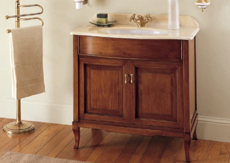 VIVIANA 90 COMPOSIZIONE BAGNO COMPLETO MOBILE LAVABO LEGNO PIANO MARMO E SOTTOLAVABO IN CERAMICA BIANCO MISURA COMPOSIZIONE : L 90 - P 56 SPECCHIO ORO/ARGENTO LAMPADA COLORE NOCE DI SERIE PRODOTTO ITALIANO