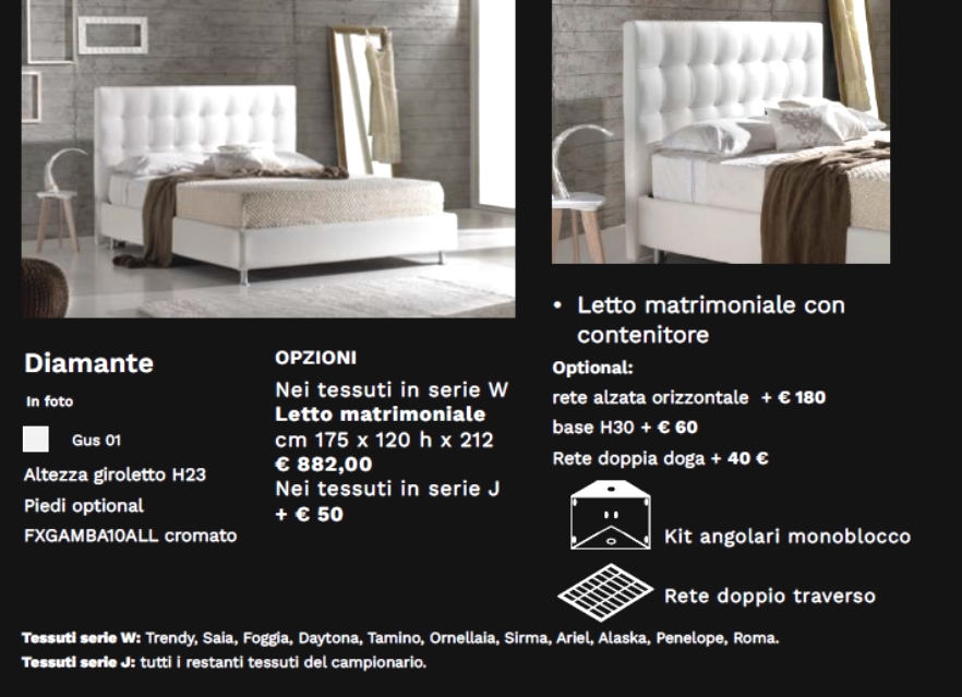 DIAMANTE LETTO MATRIMONIALE CONTENITORE Rete ortopedica con doppio rinforzo , Pannelli base interno contenitore rinforzzati e doppia traversa di sostegno + piedino centrale MIS . L 175 X P 212 H 120 ( RETE L 160 X 195/190 ) PIEDI PSMC0C10 PRODOTTO ITALIANO - ESCLUSO MATERASSO RIVESTIMENTO IN FOTO ECOPELLE ITALIANA BIANCA O TESSUTI W **