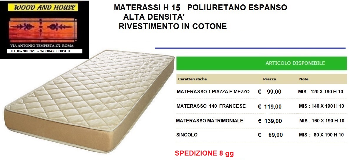 MATERASSI PANCHETTA H 15 CM POLIURETANO ESPANSO RIVESTIMENTO IN COTONE DAMASCATO CON BORDINO MISURE DISPONIBILI : SINGOLO : ..................................80 X 190 H 15 1 PIAZZA E MEZZA : .............. 120 X 190 H 15 FRANCESE : ............................. 140 X 190 H 15 MATRIMONIALE : ....................160 X 190 H 15